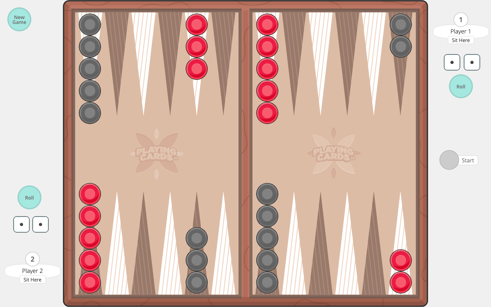 - To setup the board, each player will have mirrored checkers across from each other, occupying the rows. *For PlayingCards.io, this is already done for you. If using these rules to set up a physical game, simply refer to the setup in a Backgammon room on PlayingCards.io.