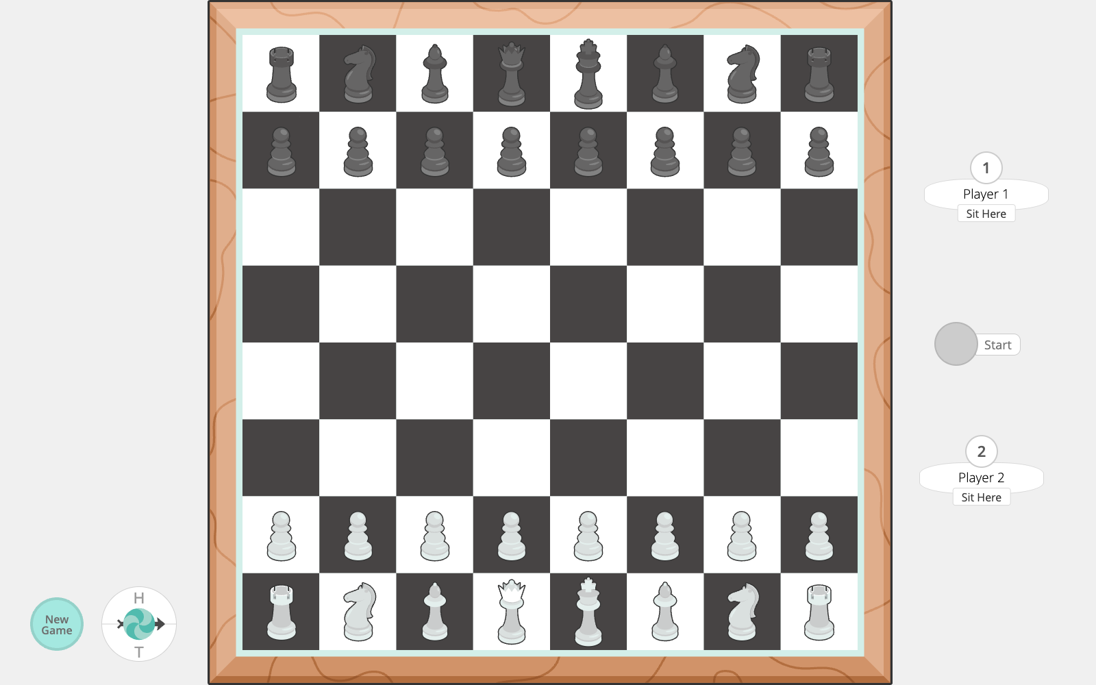 For PlayingCards.io, the pieces are already set up for you to pick a color and play. If you'd like to setup for a physical game, reference the setup in a Chess room on PlayingCards.io.