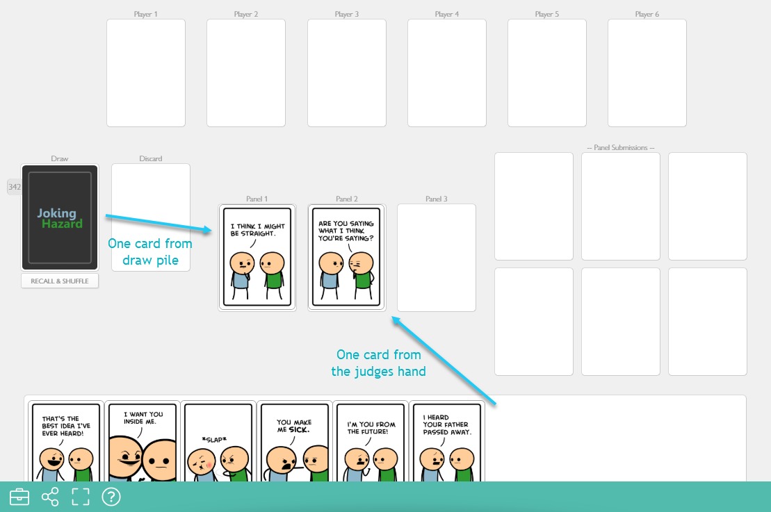 Each round, one player is designated the judge. The judge first takes a card from the draw pile. If the card has a red border it's placed in Panel 3, otherwise the card is placed in Panel 1 or 2 and the judge fills the other slot with a card from their hand.