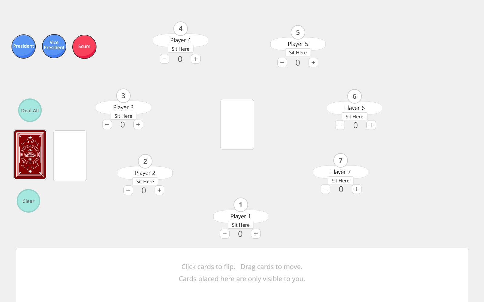 The first player to get rid of all cards in hand becomes PRESIDENT in this fast-paced card shedding game for 4-7 players. The last player with card(s) in hand is the SCUM so you'd better play quickly!