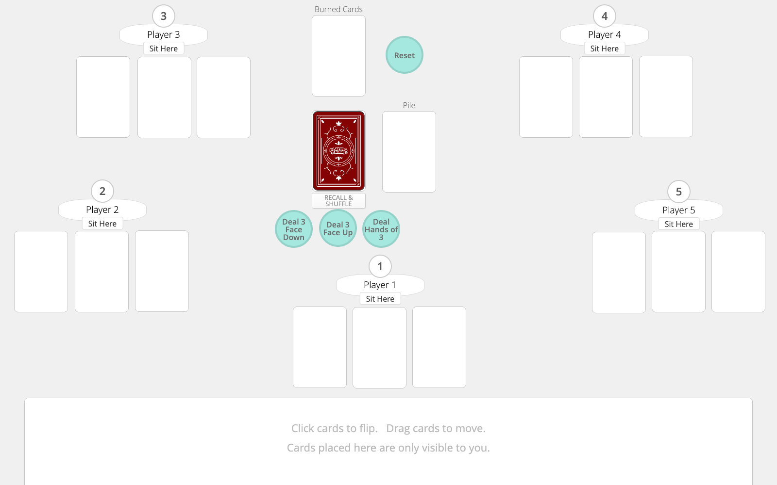 - Deal each player three cards face down (set these side by side for each player). Players DO NOT look at these cards.