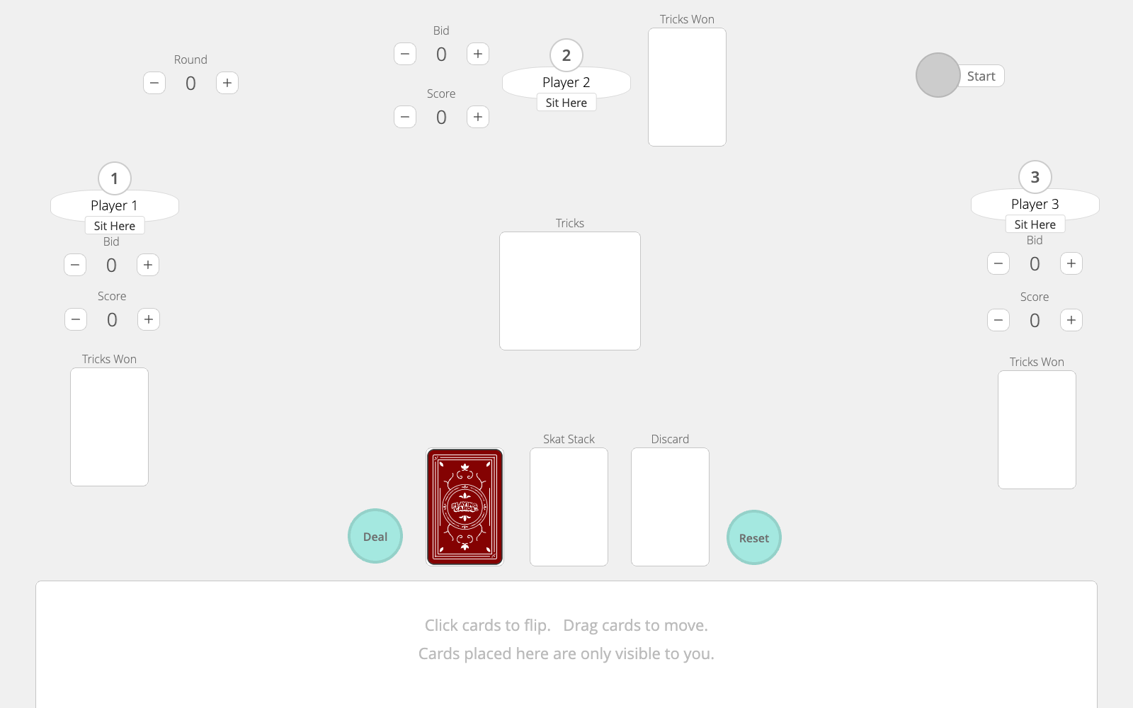 - Choose a dealer any way you like and place them in the Player 1 seat. Deal each player a hand of ten cards. The remaining two cards are placed face-down to form the Skat Stack.